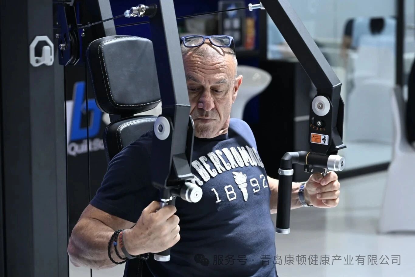 In the exhibition hall, the booth of Qingdao KINGDOM Health Industry Co., Ltd. drew particular attention—nearly 40 strength-training machines were neatly arranged, forming an impressive “steel jungle” of equipment.