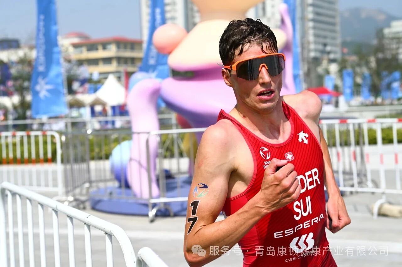 Swiss athlete Max Studer, Men's Elite Champion, during the running segment.