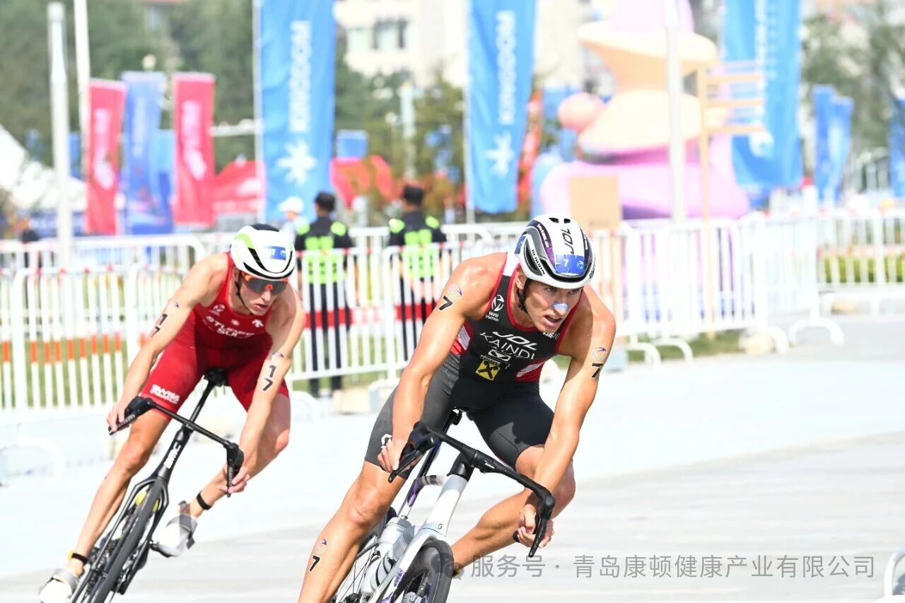 Swiss athlete Max Studer, Men's Elite Champion, competing in the cycling segment.